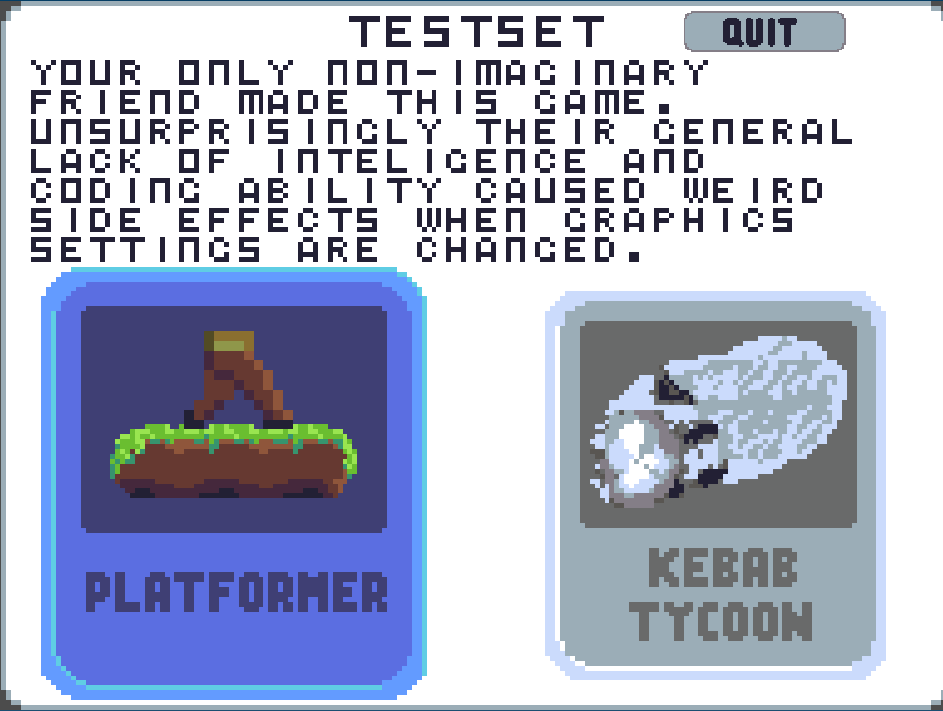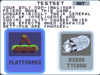 TESTSET consists of two small games, an unfinished platformer and a poorly balanced tycoon game. That sounds terrible because well, the games are terrible on purpose. In order to beat the two games you must make use of exploits and oversights placed in the code on purpose.